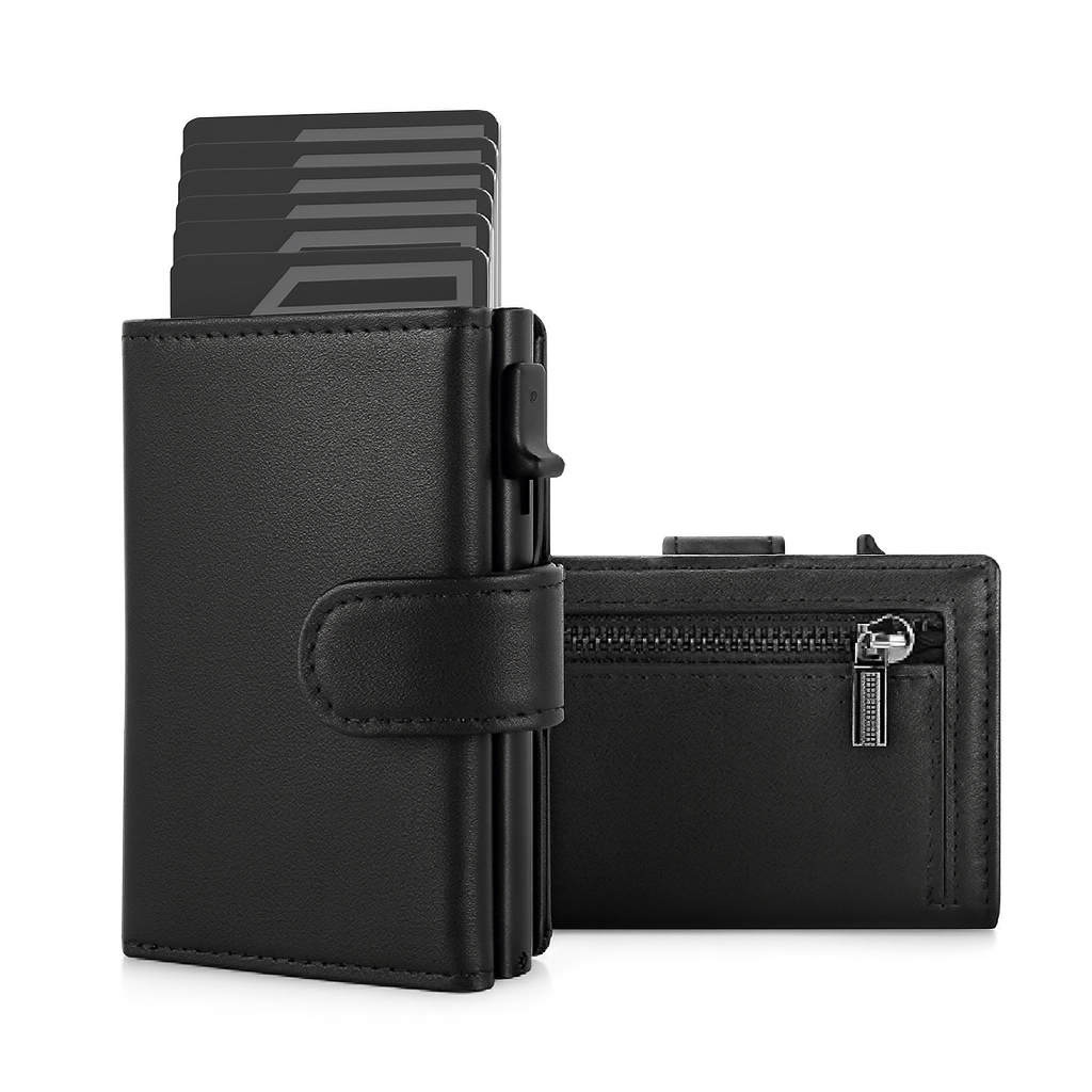محفظة بطاقات جلد طبيعي رفيعة منبثقة مع حجب RFID وجيب عملات – محفظة ذكية نحيفة ورفيعة، تصميم بسيط بسعة7 بطاقة | اسود (MW1028-1)
