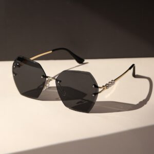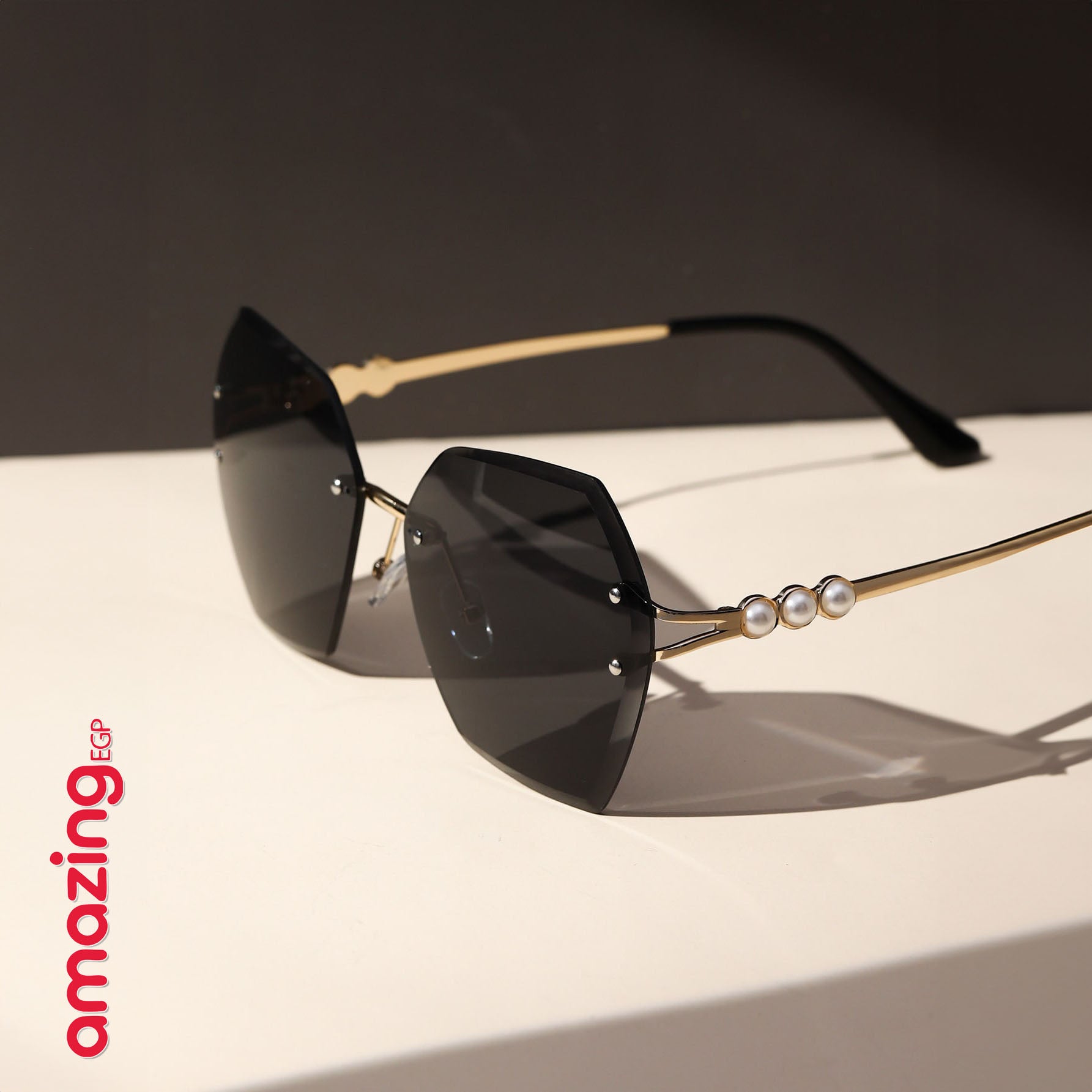 ارتقي بإطلالتك مع نظارات شمسية مضلّعة هندسية بدون إطار، مزينة بتفاصيل لؤلؤية على الذراعين لإحساس فاخر ✨. عدسات رمادية بفلترة UV400 تمنحك حماية متقدمة من أشعة الشمس 🌞 مع رؤية مريحة وواضحة.