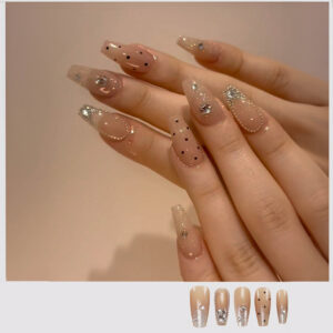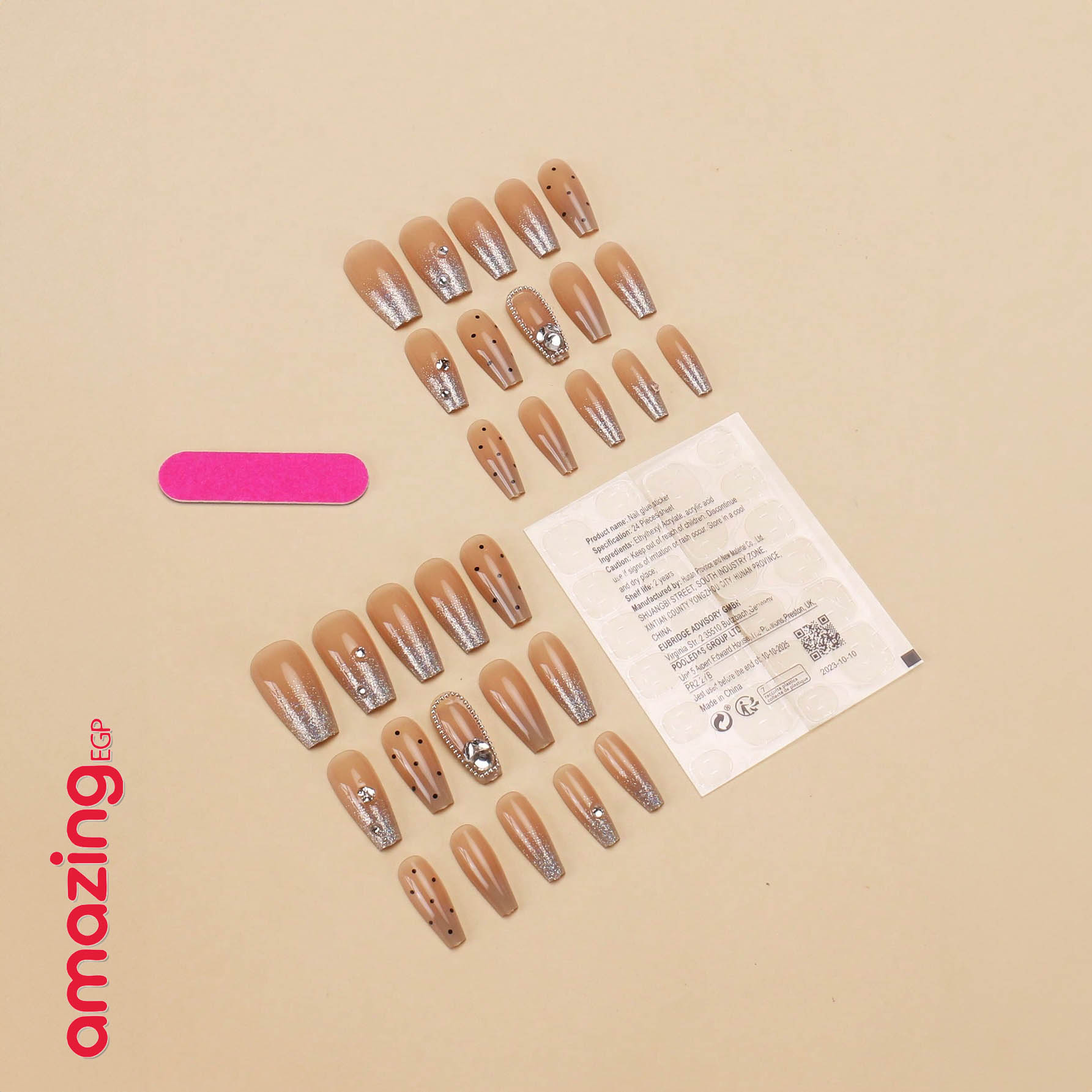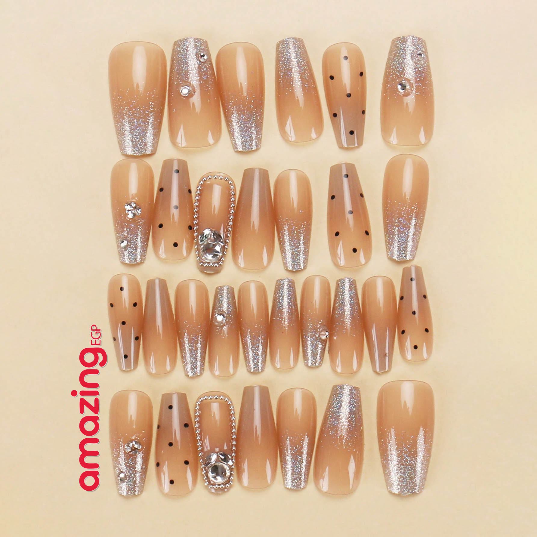 احصلي على طلة صالون في دقائق! هذه المجموعة تضم 30 قطعة أظافر تابوتية بدرجات نيود لامعة مع لمسات جلتر ونقاط عصرية وأحجار راين لمظهر أنيق يناسب الحفلات والجامعة والإطلالات اليومية. تشمل العبوة غراء جيلي (لاصقات/جلّي) ومبرد أظافر للتركيب السريع في المنزل. 💅
