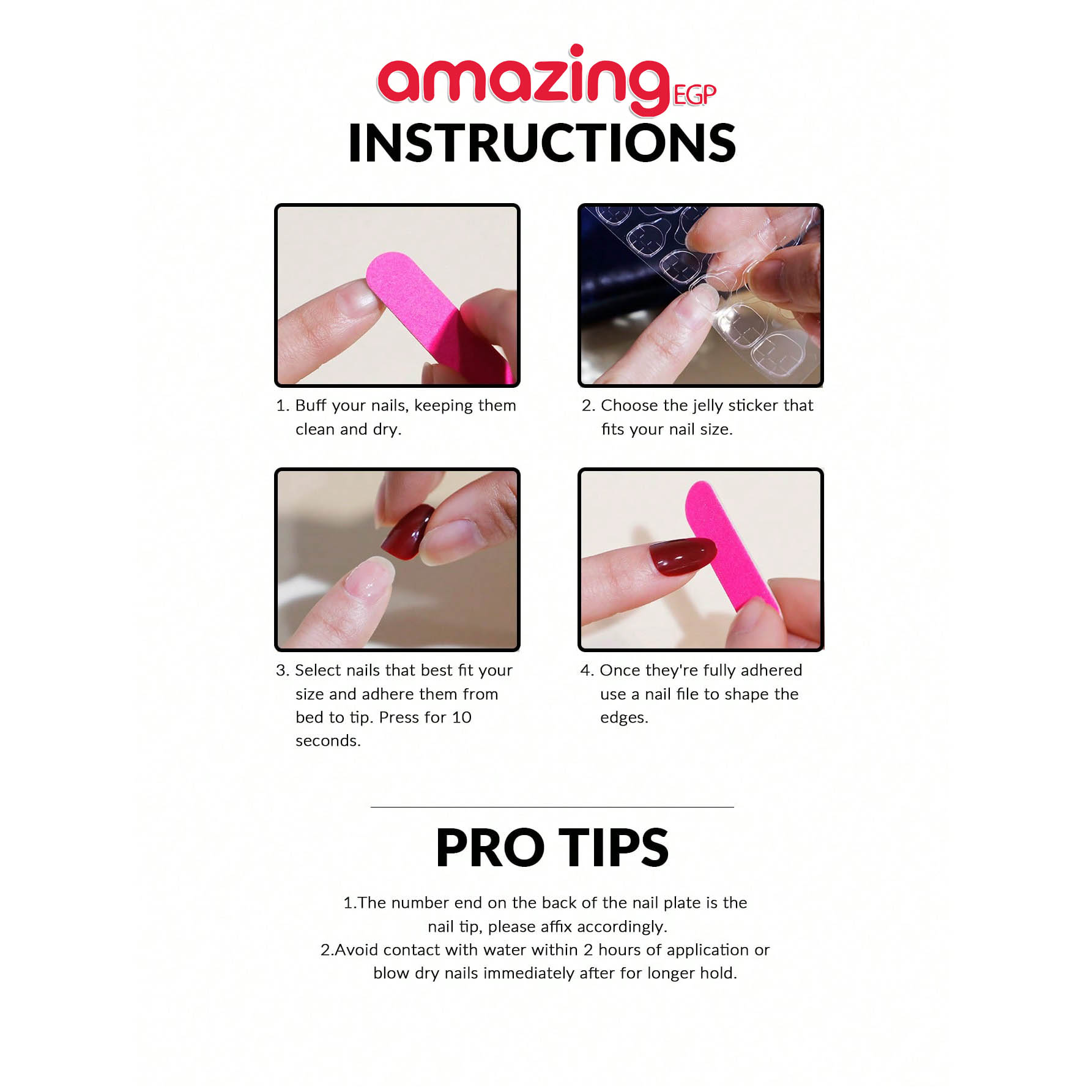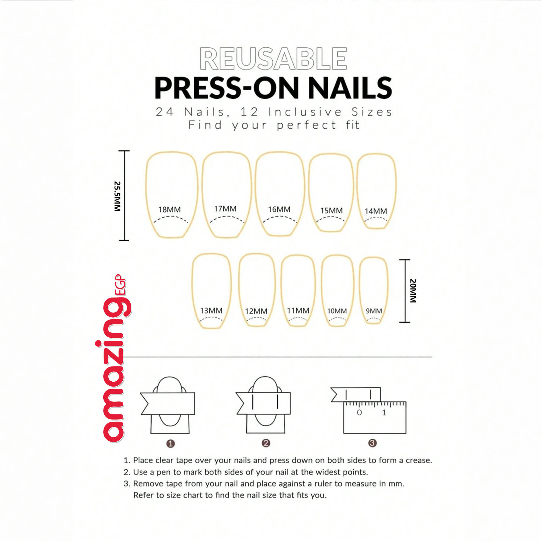 - اختاري المقاس الأنسب لكل ظفر (يمكن قصّ الحواف حسب الحاجة).